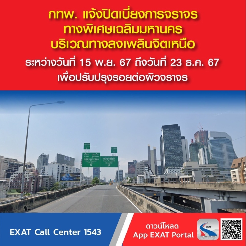 การทางพิเศษแห่งประเทศไทย (กทพ.) กระทรวงคมนาคม โดย บริษัท ประโยชน์การโยธา จำกัด ผู้รับจ้างดำเนินงานปรับปรุงรอยต่อผิวจราจรทางพิเศษเฉลิมมหานคร บริเวณทางลงเพลินจิตเหนือ มีความจำเป็นจะต้องปิดเบี่ยงการจราจรเพื่อปรับปรุงรอยต่อผิวจราจร บริเวณทางลงเพลินจิตเหนือ ในระหว่างวันที่ 15 พฤศจิกายน 2567 ถึงวันที่ 23 ธันวาคม 2567 ทั้งนี้ จะทำการปิดเบี่ยงการจราจรในวันศุกร์ถึงวันอาทิตย์ โดยเริ่มปิดการจราจร ในวันศุกร์ เวลา 22.00 น. และจะเปิดการจราจรในวันอาทิตย์ก่อนเวลา 05.00 น. (เช้าวันจันทร์) ใช้เวลาประมาณ 6 สัปดาห์ โดยมีรายละเอียดดังนี้