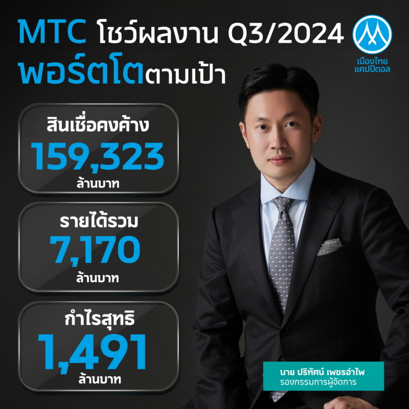 บมจ.เมืองไทย แคปปิตอล (MTC) สร้างโอกาสการเข้าถึงแหล่งเงินทุนที่เป็นธรรมและเท่าเทียม โชว์ผลการดำเนินงานไตรมาส 3/67 พอร์ตสินเชื่ออยู่ที่ 159,323 ล้านบาท เพิ่มขึ้น 14.83% และกำไรสุทธิ 1,491 ล้านบาท เพิ่มขึ้น 16.02% เทียบช่วงเดียวกันของปีก่อน พร้อมรักษาคุณภาพลูกหนี้ ทำให้สัดส่วน NPL อยู่ที่ 2.82% ฟากผู้บริหาร “ปริทัศน์ เพชรอำไพ” มั่นใจปี 67 พอร์ตสินเชื่อเติบโตตามเป้า พร้อมเดินหน้า มอบบริการทางการเงินในมาตรฐานระดับโลก เพื่อสังคมที่ยั่งยืน
