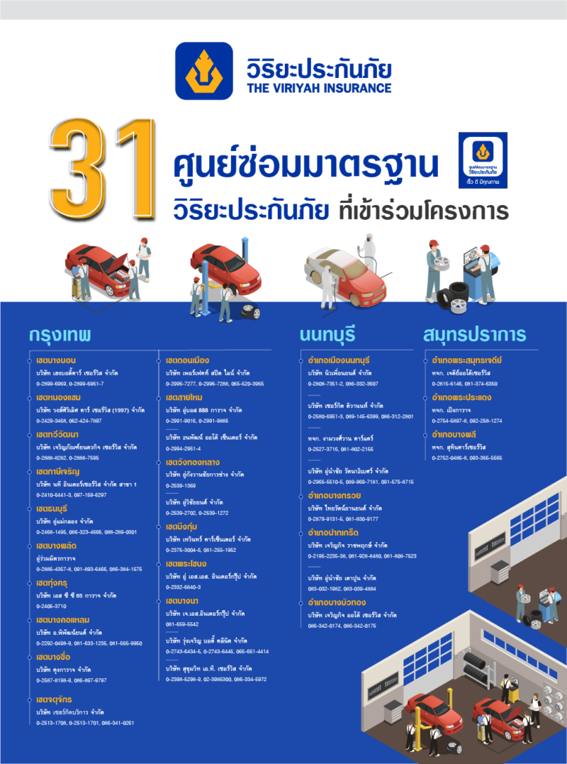 สำหรับศูนย์ซ่อมมาตรฐานวิริยะประกันภัยที่เข้าร่วมโครงการให้บริการตรวจรถฟรี จำนวน 31 แห่ง ได้แก่ 1) บริษัท เฮงบอดี้คาร์ เซอร์วิส จำกัด 2) บริษัท วงษ์ศิริเลิศ คาร์ เซอร์วิส (1997) จำกัด 3) บริษัท เจริญภัภัณฑ์ยนตรกิจ เซอร์วิส จำกัด 4) บริษัท นที อินเตอร์เซอร์วิส จำกัด สาขา 1 5) บริษัท อู่แม่กลอง จำกัด 6) อู่ร่วมมิตรการาจ 7) บริษัท เอส ซี ซี 65 การาจ จำกัด 8) บริษัท อ.พิพัฒน์ยนต์ (1989) จำกัด 9) บริษัท คุงการาจ จำกัด 10) บริษัท เซอร์กิตบริการ จำกัด 11) บริษัท เพอร์เฟคท์ สปีด ไลน์ จำกัด 12) บริษัท อู่บอส 888 การาจ จำกัด 13) บริษัท ธนพัฒน์ ออโต้ เซ็นเตอร์ จำกัด 14) บริษัท อู่กังวานชัยการช่าง จำกัด 15) บริษัท อู่วิชัยยนต์ จำกัด 16) บริษัท เทวินทร์ คาร์เซ็นเตอร์ จำกัด 17) บริษัท อู่ เอส.เอส. อินเตอร์กรุ๊ป จำกัด 18) บริษัท เจ.เอส.อินเตอร์ กรุ๊ป จำกัด 19) บริษัท รุ่งเจริญ บอดี้ คลีนิก จำกัด 20) บริษัท สุขุมวิท เอ.ที. เซอร์วิส จำกัด 21) บริษัท นิวเพื่อนยนต์ จำกัด 22) บริษัท เซอร์กิต ติวานนท์ จำกัด 23) หจก. งามวงศ์วาน คาร์แคร์ 24) บริษัท อู่นำชัย รัตนาธิเบศร์ จำกัด 25) บริษัท ไทยรัตน์ยานยนต์ จำกัด 26) บริษัท เจริญกิจ ราชพฤกษ์ จำกัด 27) บริษัท อู่นำชัย เตาปูน จำกัด 28) บริษัท เจริญกิจ ออโต้ เซอร์วิส จำกัด 29) หจก. เจดีย์ออโต้เซอร์วิส 30) หจก. เป้งการาจ 31) หจก. สุทินคาร์เซอร์วิส
