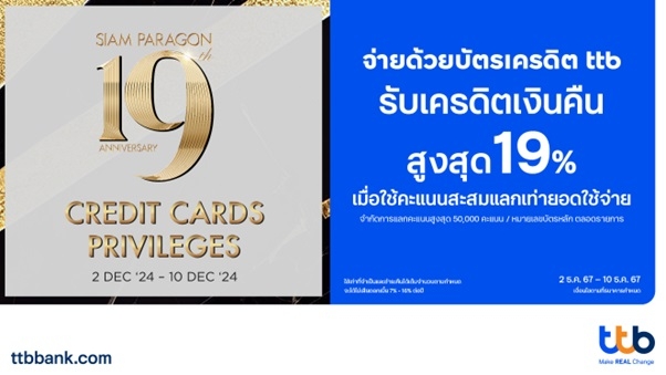 ทีเอ็มบีธนชาต หรือ ทีทีบี ร่วมกับ ศูนย์การค้าสยามพารากอน จัดแคมเปญพิเศษ “Siam Paragon 19th Anniversary” มอบสิทธิพิเศษสำหรับผู้ถือบัตรเครดิต ttb ให้ใช้จ่ายอย่างสุดคุ้มส่งท้ายปี 2567 รับเครดิตเงินคืนสูงสุด 19% เมื่อใช้คะแนนสะสมแลกเท่ายอดใช้จ่าย สำหรับบัตรหลักประเภทมีคะแนนสะสม เท่านั้น ตั้งแต่วันที่ 2 ธ.ค. 2567 – 10 ธ.ค. 2567 ดังนี้