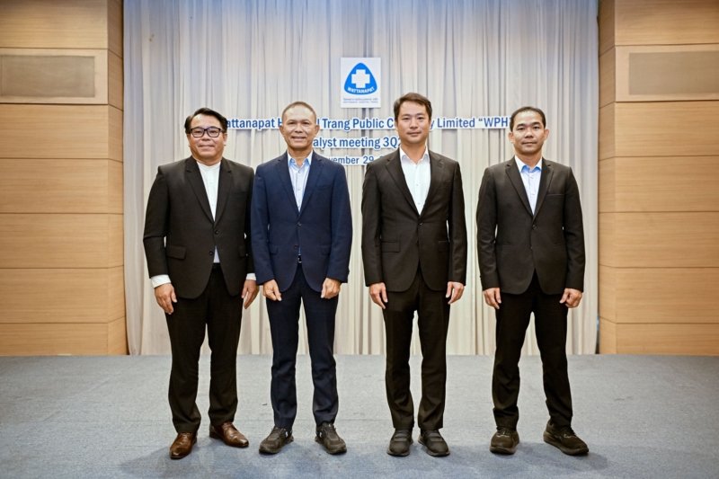 นายแพทย์สมชาย จันทร์สว่าง (ที่ 2 จากซ้าย) ประธานเจ้าหน้าที่บริหาร พร้อมด้วยนายเชน เหล่าสุนทร (ที่ 2 จากขวา) รองประธานเจ้าหน้าที่บริหาร นายวิรูฬห์ ฤทธิเกิด (ที่ 1 ซ้าย) รองผู้อำนวยการโรงพยาบาลฝ่ายการตลาด และนายวิรวิทย์ วรรณรักษ์ (ที่ 1 ขวา) ผู้จัดการฝ่ายบัญชีและการเงิน บริษัท โรงพยาบาลวัฒนแพทย์ ตรัง จำกัด (มหาชน) (WPH) ถ่ายภาพร่วมกันในงาน Analyst Meeting โดยระบุว่า บริษัทได้ขยายการลงทุนโครงการใหม่ “โรงพยาบาลวัฒนแพทย์ ภูเก็ต” งบลงทุน 1,200 ล้านบาท รองรับ 200 เตียง คาดเปิดให้บริการในไตรมาส 4 ปี 2569 จำนวน 100 เตียง รองรับฤดูกาลท่องเที่ยวของต่างชาติ โดยคาดว่าจะสามารถ Break EBITDA ได้ในปีแรก และ Break NPAT ประมาณ 1-2 ปี และจะมีผลตอบแทนจากการลงทุน (IRR) ประมาณ 25% – 30% (จากรายงานการศึกษาความเป็นไปได้ของโครงการ) โดยโครงการดังกล่าวสามารถขอใช้สิทธิส่งเสริมการลงทุนจาก BOI เพื่อยกเว้นภาษีเงินได้นิติบุคคล 100% ซึ่งกิจกรรมดังกล่าวจัดขึ้น ณ โรงแรมสวิสโซเทล กรุงเทพ รัชดา เมื่อเร็วๆ นี้