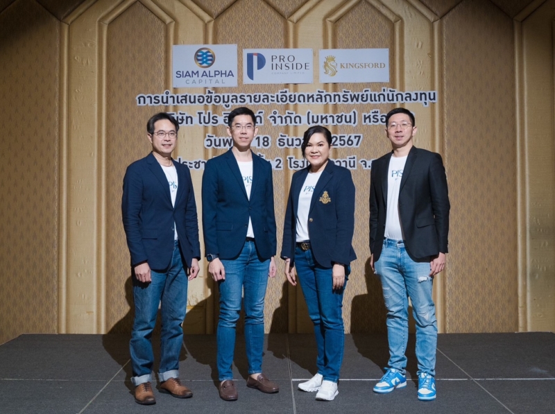 นางสาวเบญญาภา เฉลิมวัฒน์ (ที่ 2 จากขวา) ประธานเจ้าหน้าที่บริหาร นายนวัช ทัฬหิกรณ์ (ที่ 2 จากซ้าย) ผู้อำนวยการอาวุโสสายงานการเงินและบัญชี บริษัท โปร อินไซด์ จำกัด (มหาชน) หรือ PIS พร้อมด้วย นายโชษิต เดชวนิชยนุมัติ (ที่ 1จากซ้าย) กรรมการผู้จัดการ บริษัท สยาม อัลฟา แคปปิตอล จำกัด ที่ปรึกษาทางการเงิน และ นายชานนทร์ ปิยสุนทร (ที่ 1 จากขวา) ผู้อำนวยการอาวุโส ฝ่ายวาณิชธนกิจ บริษัทหลักทรัพย์ คิงส์ฟอร์ด จำกัด (มหาชน) ในฐานะแกนนำในการจัดจำหน่ายหุ้น ร่วมนำเสนอข้อมูลรายละเอียดหลักทรัพย์แก่นักลงทุนใน จ.ขอนแก่น โดยมีแผนเข้าจดทะเบียนในตลาดหลักทรัพย์เอ็ม เอ ไอ (mai) เพื่อเสนอขายหุ้น IPO จำนวน 140 ล้านหุ้น ซึ่งงานดังกล่าวจัดขึ้นเมื่อเร็วๆ นี้
