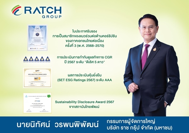 บริษัท ราช กรุ๊ป จำกัด (มหาชน) ยึดมั่นการกำกับดูแลกิจการที่ดี โดยมุ่งสร้างองค์กรโปร่งใส ต่อต้านการทุจริตและคอร์รัปชันทุกรูปแบบ ดำรงไว้ซึ่งการปฏิบัติอย่างเป็นธรรมต่อผู้มีส่วนได้เสียตลอดห่วงโซ่คุณค่าธุรกิจ ตลอดจนการสร้างคุณค่าด้านเศรษฐกิจ สังคม และสิ่งแวดล้อมในการดำเนินธุรกิจให้สมดุล เพื่อการเติบโตอย่างยั่งยืนของบริษัทฯ ความมุ่งมั่นดังกล่าวได้ขับเคลื่อนสู่การปฏิบัติอย่างต่อเนื่องและมีความก้าวหน้ามาเป็นลำดับ ในปีนี้ บริษัทฯ ได้รับการรับรองการเป็นสมาชิกของแนวร่วมต่อต้านคอร์รัปชันของภาคเอกชนไทย (Thai Private Sector Collective Action Against Corruption: CAC) ต่อเนื่องเป็นครั้งที่ 3 โดยมีระยะเวลา 3 ปี (ปี 2568-2570) อีกทั้งยังได้รับผลการประเมินการกำกับดูแลกิจการบริษัทจดทะเบียนไทย (Corporate Governance Report of Thai Listed Companies: CGR) ประจำปี 2567 โดยสมาคมส่งเสริมสถาบันกรรมการบริษัทไทย (IOD) ในระดับดีเลิศ หรือ 5 ดาว ต่อเนื่องตั้งแต่ปี 2558 และบริษัทฯ ได้ผ่านเกณฑ์การประเมินความยั่งยืนจากตลาดหลักทรัพย์แห่งประเทศไทย อยู่ในกลุ่มหุ้นยั่งยืนนับตั้งแต่ปี 2558 จนถึงปัจจุบัน ซึ่งผลการประเมินหุ้นยั่งยืน SET ESG Ratings ประจำปี 2567 บริษัทฯ อยู่ในระดับ AAA นอกจากนี้ บริษัทฯ ยังได้รับรางวัลเกียรติคุณ “Sustainability Disclosure Award” ประจำปี 2567 จากสถาบันไทยพัฒน์ ต่อเนื่องเป็นปีที่ 6