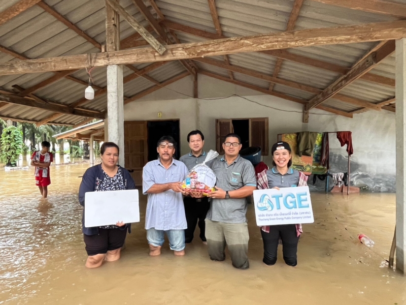 คุณสืบตระกูล บินเทพ (ที่3 จาก ขวา) ประธานเจ้าหน้าที่บริหาร บริษัท ท่าฉาง กรีน เอ็นเนอร์ยี่ จำกัด (มหาชน) (TGE) ผู้นำด้านอุตสาหกรรมพลังงานทดแทนที่เป็นมิตรต่อชุมชนและสิ่งแวดล้อม ลงพื้นที่มอบถุงยังชีพพร้อมของที่จำเป็นให้กับผู้ประสบภัยน้ำท่วมบริเวณใกล้เคียงสถานประกอบการ อ.ท่าฉาง จ.สุราษฎร์ธานี พร้อมทั้งช่วยตรวจสอบระบบไฟฟ้าในบ้านของผู้ที่ประสบภัยน้ำท่วมในพื้นที่ดังกล่าว เพื่อป้องกันอันตรายจากกระแสไฟฟ้าลัดวงจรซึ่งเป็นความเสียหายที่อาจจะเกิดได้ถึงชีวิต ซึ่งกิจกรรมดังกล่าวจัดขึ้นเมื่อเร็วๆ นี้