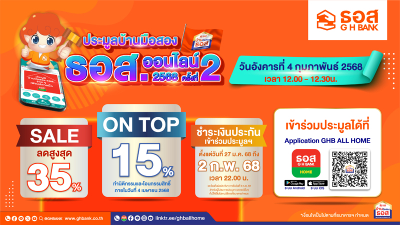 ธนาคารอาคารสงเคราะห์ (ธอส.) สนับสนุนคนไทยให้มีที่อยู่อาศัยเป็นของตนเอง จัดทรัพย์เด่น ทำเลดี ราคาสุดคุ้มถึง 1,439 รายการทั่วประเทศ เข้าร่วม “งานประมูลขายบ้านมือสองออนไลน์ ครั้งที่ 2/2568 ประจำเดือนกุมภาพันธ์” วันอังคารที่ 4 กุมภาพันธ์ 2568 เวลา 12.00 – 12.30 น. ผ่าน Application : GHB ALL HOME พิเศษ!! รับส่วนลดสูงสุดถึง 35% จากราคาปกติ และรับส่วนลด On top เพิ่มอีก 15% หากทำนิติกรรมและโอนกรรมสิทธิ์ภายในวันที่ 4 เมษายน 2568