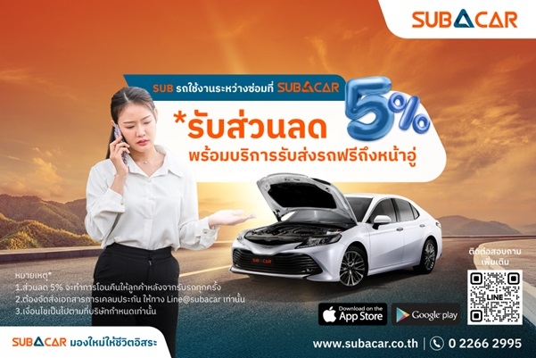 พิเศษ! สำหรับลูกค้าที่จองแพคเกจตั้งแต่ 1 สัปดาห์ขึ้นไป รับส่วนลด 5% สนใจบริการจองรถออนไลน์กับ SUB A CAR ได้ตั้งแต่วันนี้ ตลอด 24 ชั่วโมง เพียงดาวน์โหลดแอปพลิเคชัน “SUB A CAR” (ทั้งระบบ IOS และ Android) จบครบในแอปเดียว หรือสอบถามข้อมูลเพิ่มเติมได้ที่ Line: @subacar โทร. 0-2266-2995 หรือเว็บไซต์ www.subacar.co.th