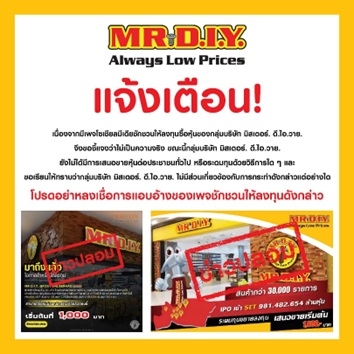กรุงเทพฯ, – บริษัท มิสเตอร์. ดี.ไอ.วาย. โฮลดิ้ง (ประเทศ) จำกัด (มหาชน) (“บริษัทฯ”) ผู้นำธุรกิจค้าปลีกอุปกรณ์ตกแต่งบ้านและสินค้าไลฟ์สไตล์ แจ้งเตือนประชาชนให้ระมัดระวังการหลอกลวงในรูปแบบการชักชวนลงทุนจองซื้อหุ้นของบริษัทฯ ผ่านโซเชียลมีเดีย เนื่องจากขณะนี้มีผู้หลงเชื่อเป็นจำนวนมาก เพื่อป้องกันการสับสน หลงผิด และเพื่อป้องกันความเสียหายแก่ประชาชน ทางบริษัทฯ ขอชี้แจงว่า ข้อมูลตามที่มีการแอบอ้างดังกล่าวไม่เป็นความจริง เนื่องด้วยในขณะนี้กลุ่มบริษัทฯ ยังไม่มีการเสนอขายหุ้นแก่ประชาชน หรือการระดมทุนในรูปแบบใดๆ นอกจากนี้ ทางกลุ่มบริษัทฯ ไม่มีส่วนเกี่ยวข้องใด ๆ กับการแอบอ้างหรือกล่าวอ้างถึง หรือรับรองการกระทำดังกล่าวในทุกกรณี โดยบริษัทฯ ขอสงวนสิทธิในการดำเนินการตามกฎหมายต่อผู้เกี่ยวข้องทั้งหมดต่อไป