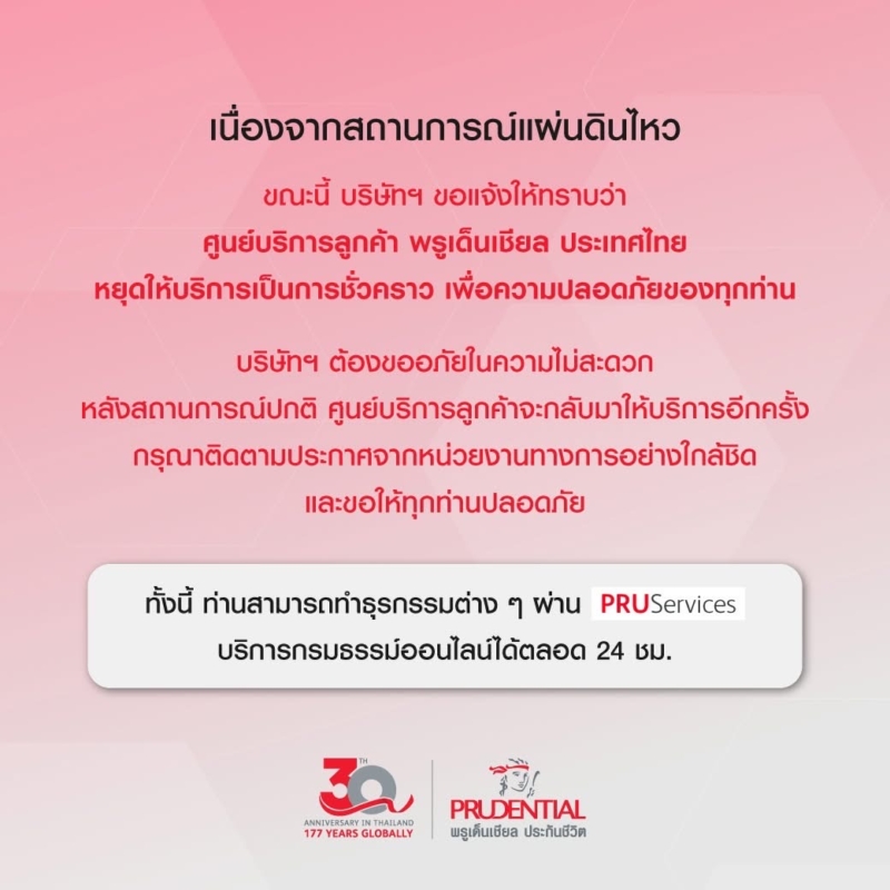 เนื่องจากสถานการณ์แผ่นดินไหว ขณะนี้ พรูเด็นเชียล ประเทศไทย ขอแจ้งให้ทราบว่า ศูนย์บริการลูกค้า พรูเด็นเชียล ประเทศไทย หยุดให้บริการเป็นการชั่วคราว เพื่อความปลอดภัยของทุกท่าน บริษัทฯ ต้องขออภัยในความไม่สะดวก หลังสถานการณ์ปกติ ศูนย์บริการลูกค้าจะกลับมาให้บริการอีกครั้ง