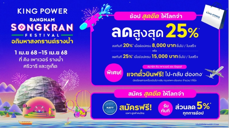 คิง เพาเวอร์ จัดงาน “อภิมหาสงกรานต์รางน้ำ มโหฬาร มหาสนุก” ช้อปสุดคุ้มได้ทุกที่ รับส่วนลดสูงสุด 25% เมื่อช้อปครบ 15,000 บาท / ใบเสร็จ หรือรับส่วนลดสูงสุด 20% เมื่อช้อปครบ 8,000 บาท / ใบเสร็จ พิเศษสำหรับสมาชิก! แจกตั๋วเครื่องบินไป-กลับ กรุงเทพฯ-ฮ่องกง 1 ที่นั่ง เพียงช้อปครบ 50,000 บาทขึ้นไป (สุทธิ) ตั้งแต่วันที่ 1 – 15 เมษายน 2568 ที่ คิง เพาเวอร์ รางน้ำ ศรีวารี และภูเก็ต