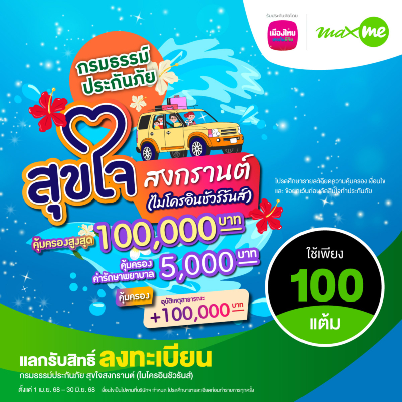เมืองไทยประกันชีวิต ผนึกกำลัง แมกซ์ โซลูชัน บริษัทในเครือพีทีจี ร่วมเติมเต็มความสุขและความอุ่นใจในเทศกาลสงกรานต์ ปี 2568 แก่สมาชิก Max Card ทั่วประเทศ ผ่าน “กรมธรรม์ประกันภัยสุขใจสงกรานต์ (ไมโครอินชัวรันส์)” ที่ให้ความคุ้มครองครอบคลุมทั้งด้านชีวิตและค่ารักษาพยาบาลเนื่องจากอุบัติเหตุ เพียงสมาชิก Max Card เพียงใช้คะแนน 100 คะแนน แลกรับสิทธิ์ผ่านช่องทาง แอปพลิเคชัน Max Me