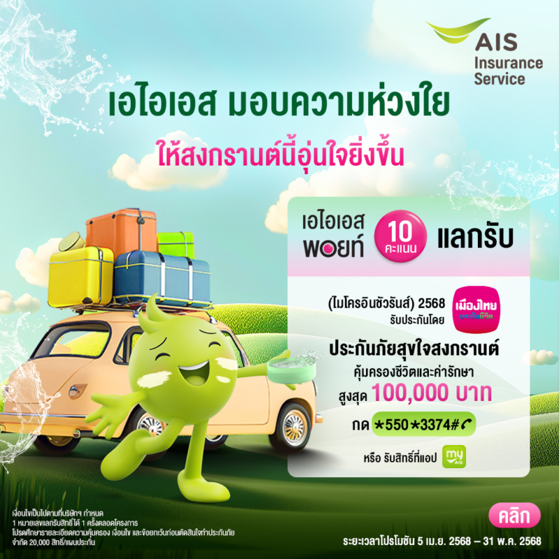 เมืองไทยประกันชีวิต ผนึกกำลัง AIS มอบความอุ่นใจให้กับลูกค้า AIS ทั้งมือถือและเน็ตบ้าน ได้สนุก มีความสุขอย่างเต็มที่ในช่วงเทศกาลสงกรานต์ ปี 2568 ผ่าน “กรมธรรม์ประกันภัยสุขใจสงกรานต์ (ไมโครอินชัวรันส์)” ประกันภัยอุบัติเหตุกลุ่มที่ให้ความคุ้มครองครอบคลุมทั้งด้านชีวิตและค่ารักษาพยาบาล อันเนื่องมาจากอุบัติเหตุ เพียงลูกค้าใช้ AIS Points 10 คะแนน แลกรับสิทธิ์ผ่านทางแอปพลิเคชัน myAIS หรือ กด *550*3374# ตั้งแต่วันที่ 5 เมษายน 2568 – 31 พฤษภาคม 2568 นี้ (จำนวนจำกัด 20,000 สิทธิ์)