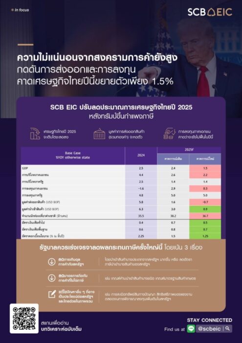 ทั้งนี้เศรษฐกิจไทยจะเผชิญความไม่แน่นอนที่สูงขึ้นมากในระยะข้างหน้า โดยเฉพาะจากนโยบายภาษีนำเข้าของสหรัฐฯ ที่อาจเปลี่ยนแปลงได้ตลอด ขึ้นอยู่กับความสำเร็จและระยะเวลาในการเจรจาต่อรองของรัฐบาลไทยเป็นหลัก SCB EIC มอง กนง. จะปรับลดดอกเบี้ยเหลือ 1.25% ณ สิ้นปี 2025 หากเจรจาไม่สำเร็จ