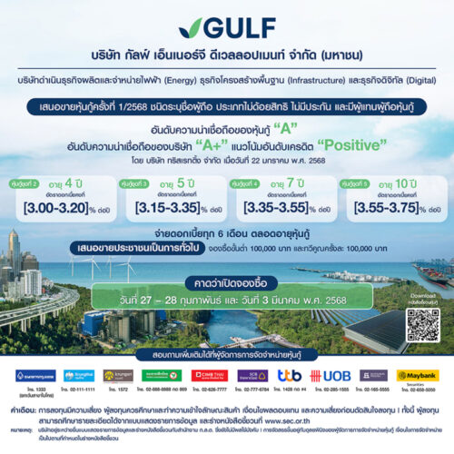 1 min read การเงิน-การลงทุน GULF เตรียมเสนอขายหุ้นกู้เรทติ้ง “A” อายุหุ้นกู้ตั้งแต่ 4-10 ปี ดอกเบี้ยคงที่ระหว่าง 3.00-3.75% ต่อปี ปลายก.พ.68 3 กุมภาพันธ์ 2025 admin