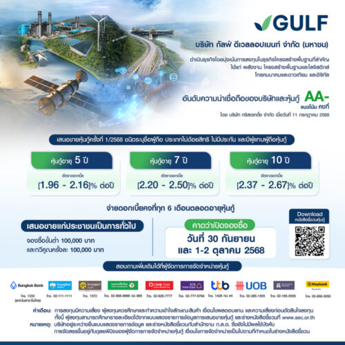 1 min read การเงิน-การลงทุน GULF ประกาศช่วงอัตราดอกเบี้ยหุ้นกู้ อายุ 5-10 ปี ที่ [1.96 – 2.67]% ต่อปี 30 สิงหาคม 2025 admin