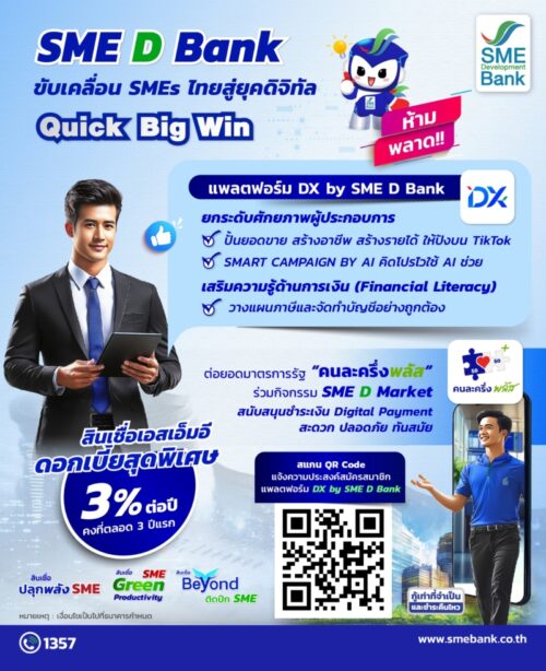 1 min read การเงิน-การลงทุน SME D Bank ขับเคลื่อนนโยบาย Quick Big Win ชูแพลตฟอร์ม “DX” 17 ตุลาคม 2025 admin