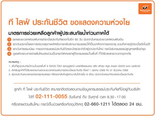 1 min read ประกัน ที ไลฟ์ ประกันชีวิต ออกมาตรการช่วยเหลือลูกค้าผู้ประสบภัยน้ำท่วมภาคใต้ 2 ธันวาคม 2025 admin