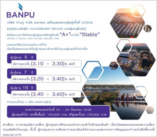 1 min read การเงิน-การลงทุน บ้านปูเตรียมออกและเสนอขายหุ้นกู้ 3 ชุด ดอกเบี้ยคงที่ [3.10 – 3.60]% ต่อปี อันดับความน่าเชื่อถือ “A+” 29 สิงหาคม 2025 admin