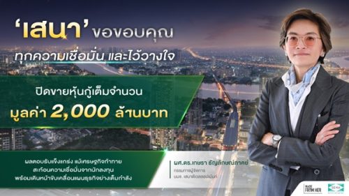1 min read การเงิน-การลงทุน เสนา ปิดขายหุ้นกู้ 2,000 ลบ. เต็มจำนวน สะท้อนความเชื่อมั่นนักลงทุน พร้อมเดินหน้าแผนธุรกิจเต็มกำลัง 7 กุมภาพันธ์ 2026 admin