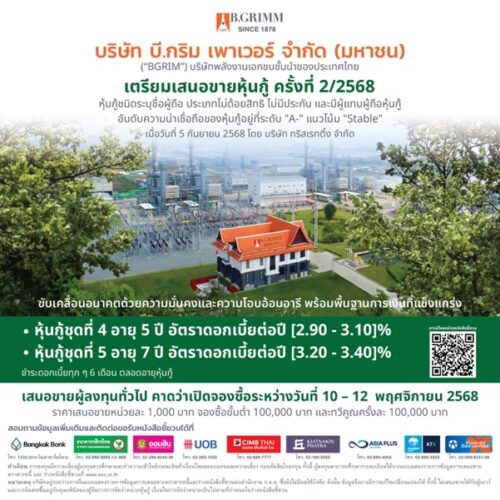 1 min read การเงิน-การลงทุน BGRIM เปิดตัว Blue Bond ครั้งแรก! พร้อมเสนอขายหุ้นกู้ 3 – 10 ปี เพื่อชำระหนี้ และลงทุนโครงการพลังงานลมนอกชายฝั่งเกาหลีใต้ 15 กันยายน 2025 admin